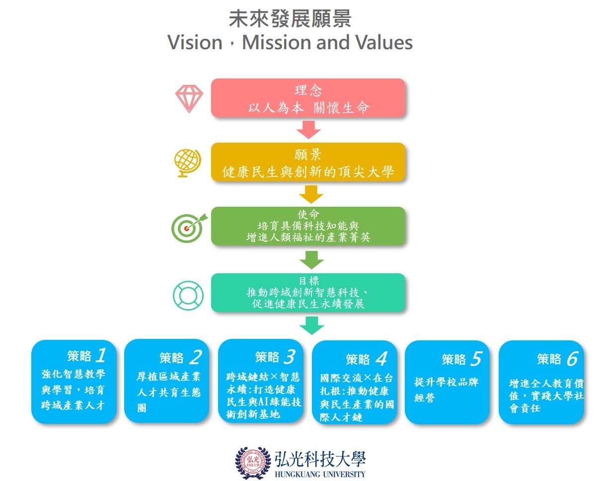 本圖為「未來發展願景」示意圖,內容包含學校未來發展方向、策略布局、目標項目及關鍵重點。