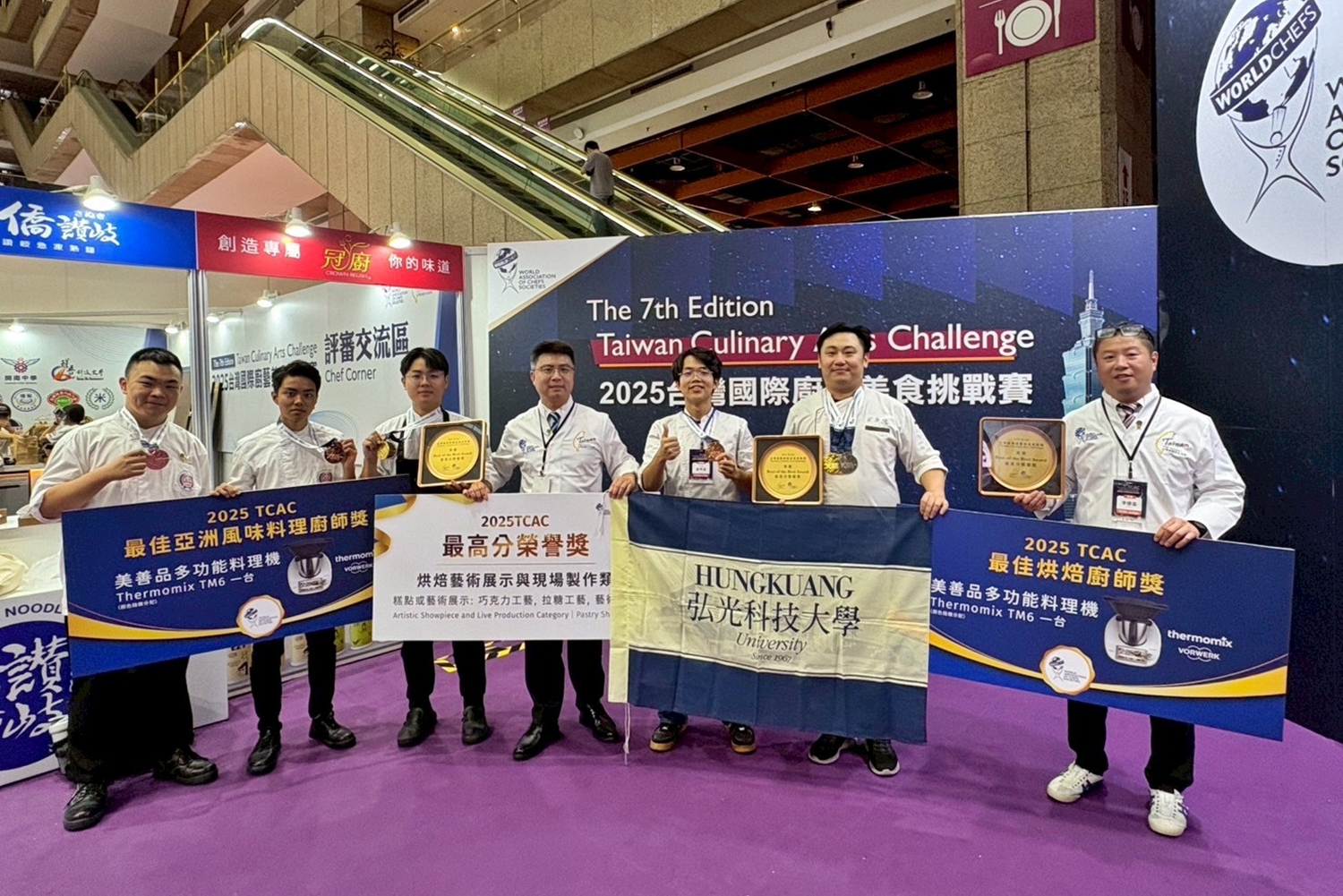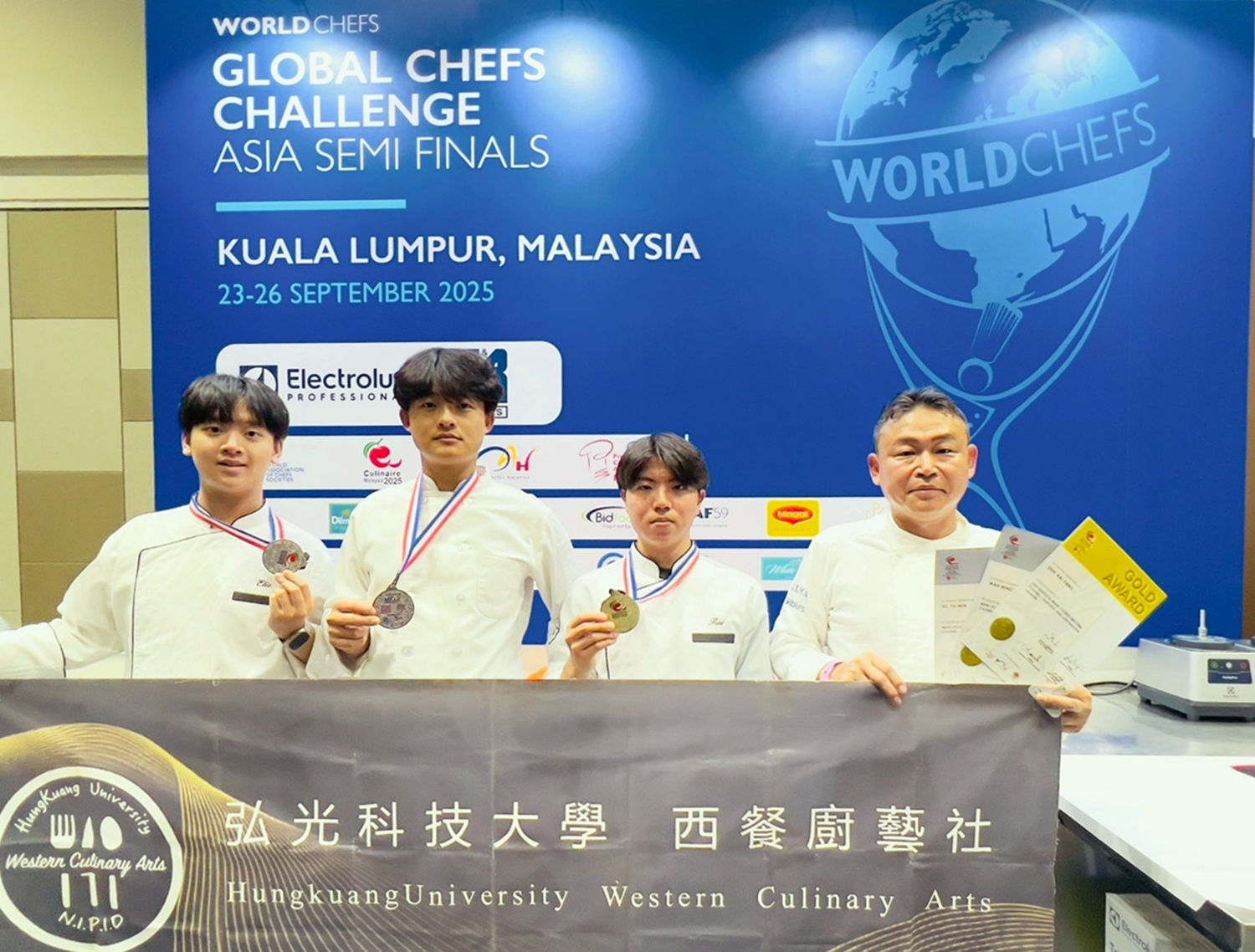 國際餐旅學院師生大放異彩,食品科技系老師張原賓、餐旅管理系大三學生高承洋一口氣挑戰「2025台灣國際廚藝美食挑戰賽」三項比賽,分別拿下大會最高榮譽最佳烘焙廚師獎、最佳亞洲風味料理廚師獎;餐旅管理系大三學生施凱揚則以香菜獨特調味,奪得「2025吉隆坡FHM國際廚藝競賽」西式鮭魚海鮮主菜最高分金牌。
