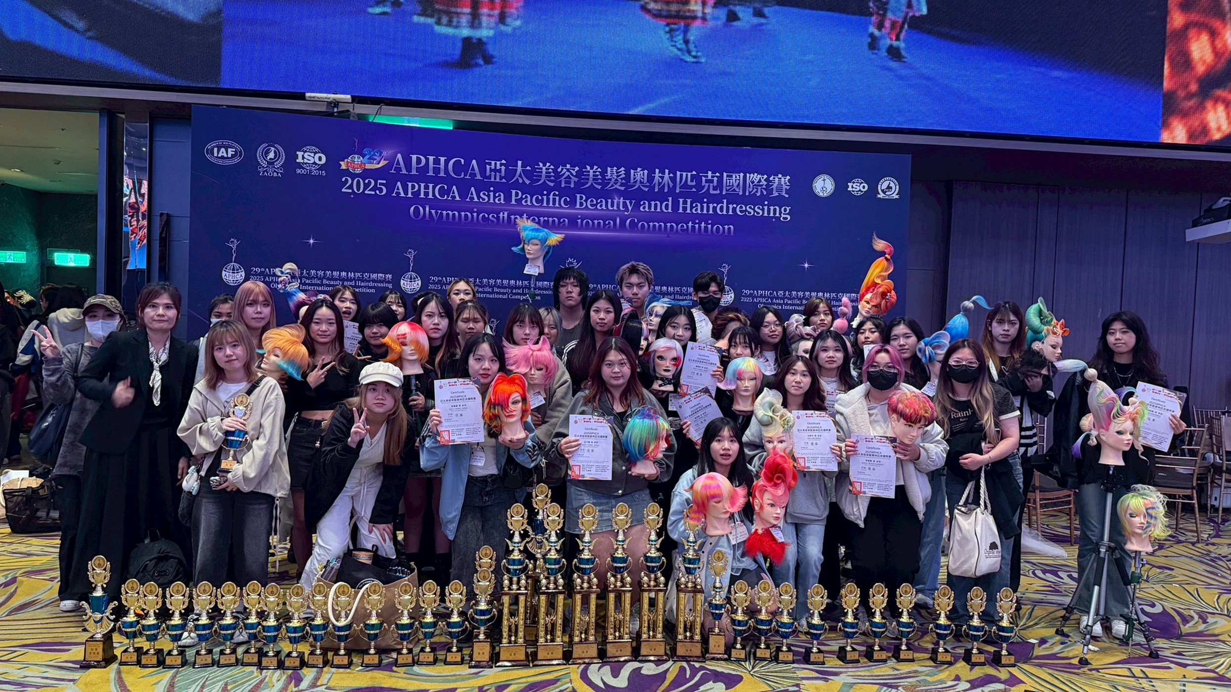 美髮造型設計系學生接受呂佩芸、黃翠如、馬惠君老師指導,在廖晏伶組長、洪煒智老師帶隊下,於10月21日生參加「2025 APH亞太盃奧林匹克國際競賽」,在眾多參賽隊伍中脫穎而出,榮獲7冠軍、2亞軍、2季軍佳績。
