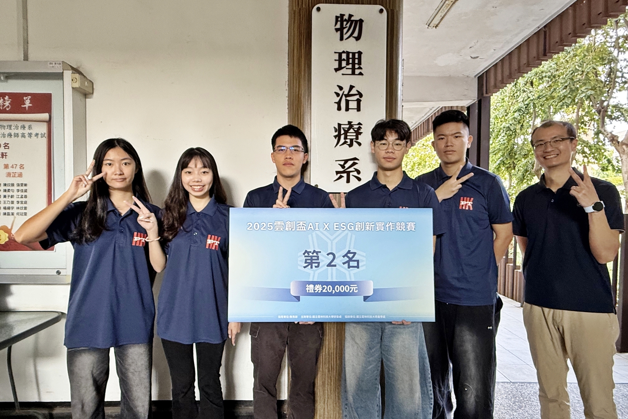 物理治療系楊文傑助理教授指導大二學生鄧琮諺、劉子琳、張立圻、徐紫音、陳佑鑫,參加「2025雲創盃 AI × ESG 創新實作競賽」,以結合人工智慧、非穿戴式遊戲與運動復健概念的作品「PlayXercise 玩樂動體感遊戲」,從眾多參賽隊伍中脫穎而出,榮獲全國第二名佳績,展現學生將在AI應用於健康促進、落實永續發展的實務創新能力。