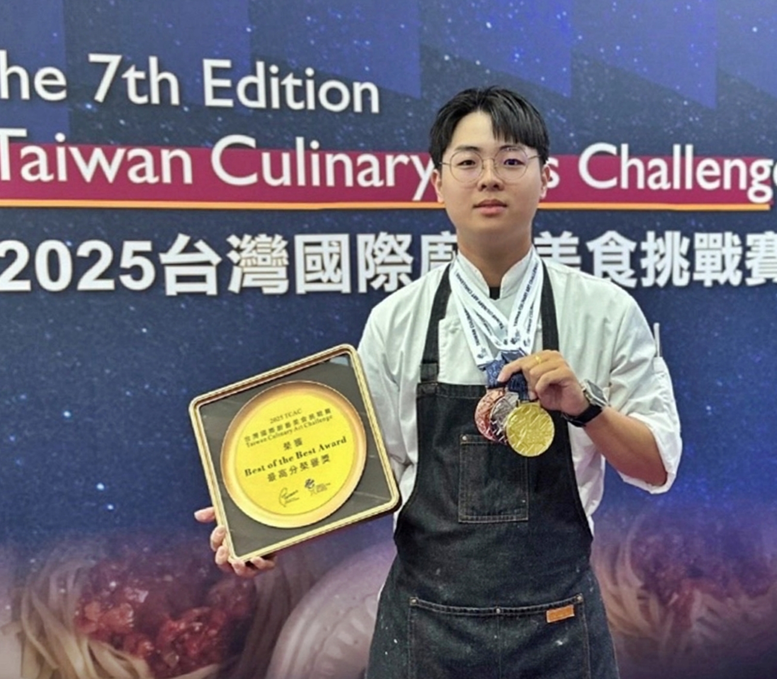 國際餐旅學院師生大放異彩,食品科技系老師張原賓、餐旅管理系大三學生高承洋一口氣挑戰「2025台灣國際廚藝美食挑戰賽」三項比賽,分別拿下大會最