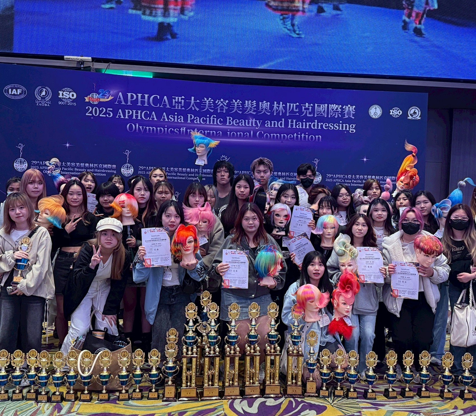 美髮造型設計系學生接受呂佩芸、黃翠如、馬惠君老師指導,在廖晏伶組長、洪煒智老師帶隊下,於10月21日生參加「2025 APH亞太盃奧林匹克國