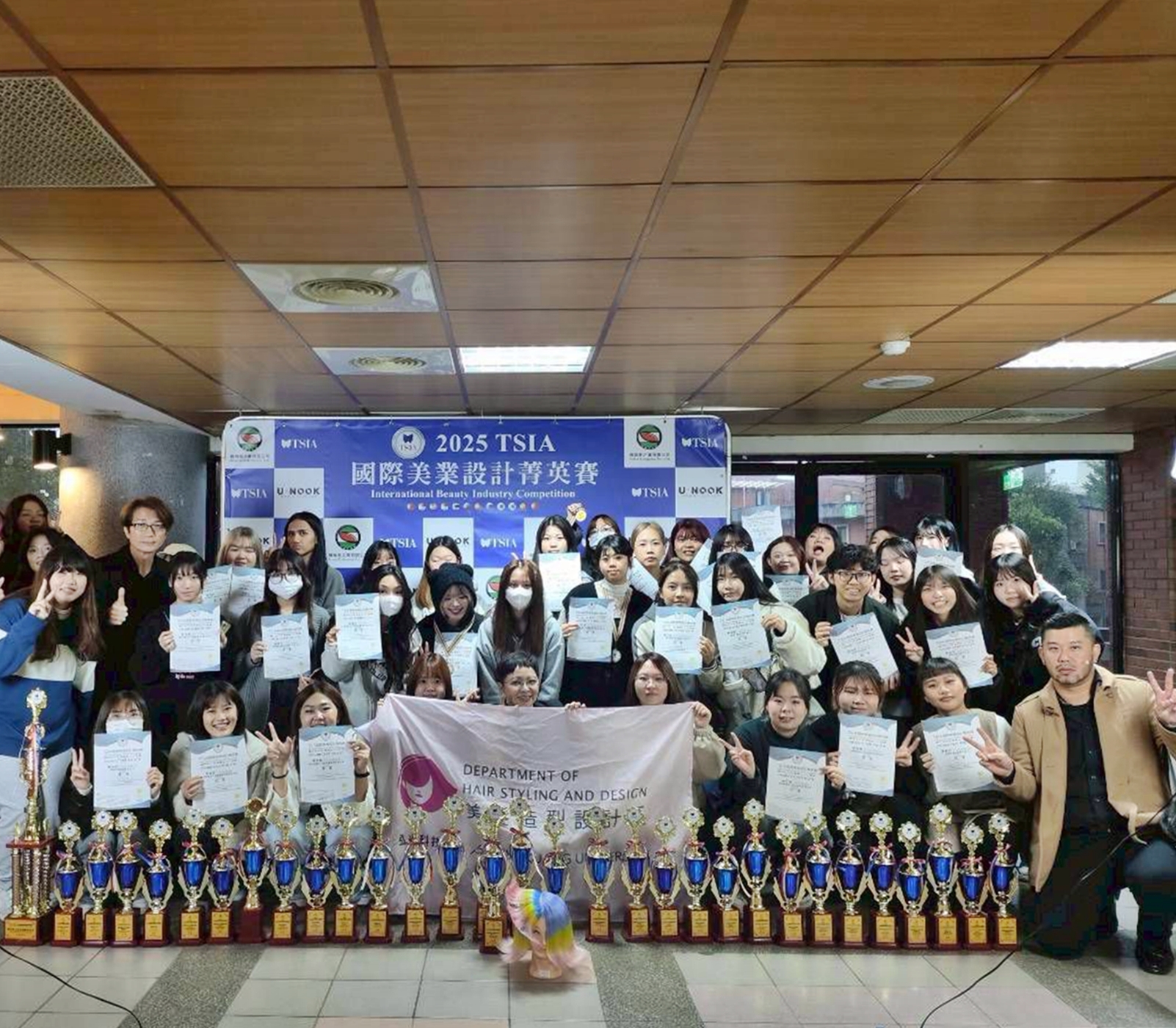 文化設計與行銷系、美髮造型設計系、化妝品應用系學生參加「2025 TSIA 國際美業設計菁英賽」,分別勇奪5個冠軍、13個冠軍、9個冠軍,總