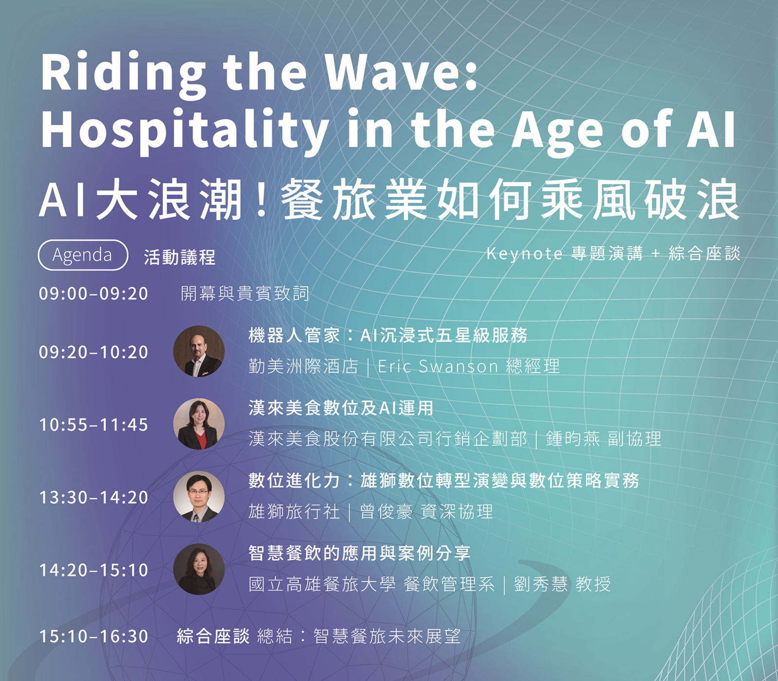 本論壇將於114年12月12日(星期五)舉辦,歡迎報名參加。論壇旨在回應 AI 技術於餐旅產業的快速發展趨勢,透過專題演講與產學交流,探討