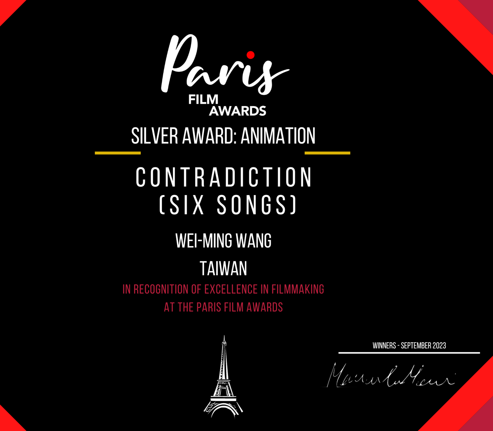 多遊系助理教授王瑋名以作品矛盾(六部曲)Contradiction (Six Songs),獲得巴黎電影節9月動畫銀獎。Paris Film