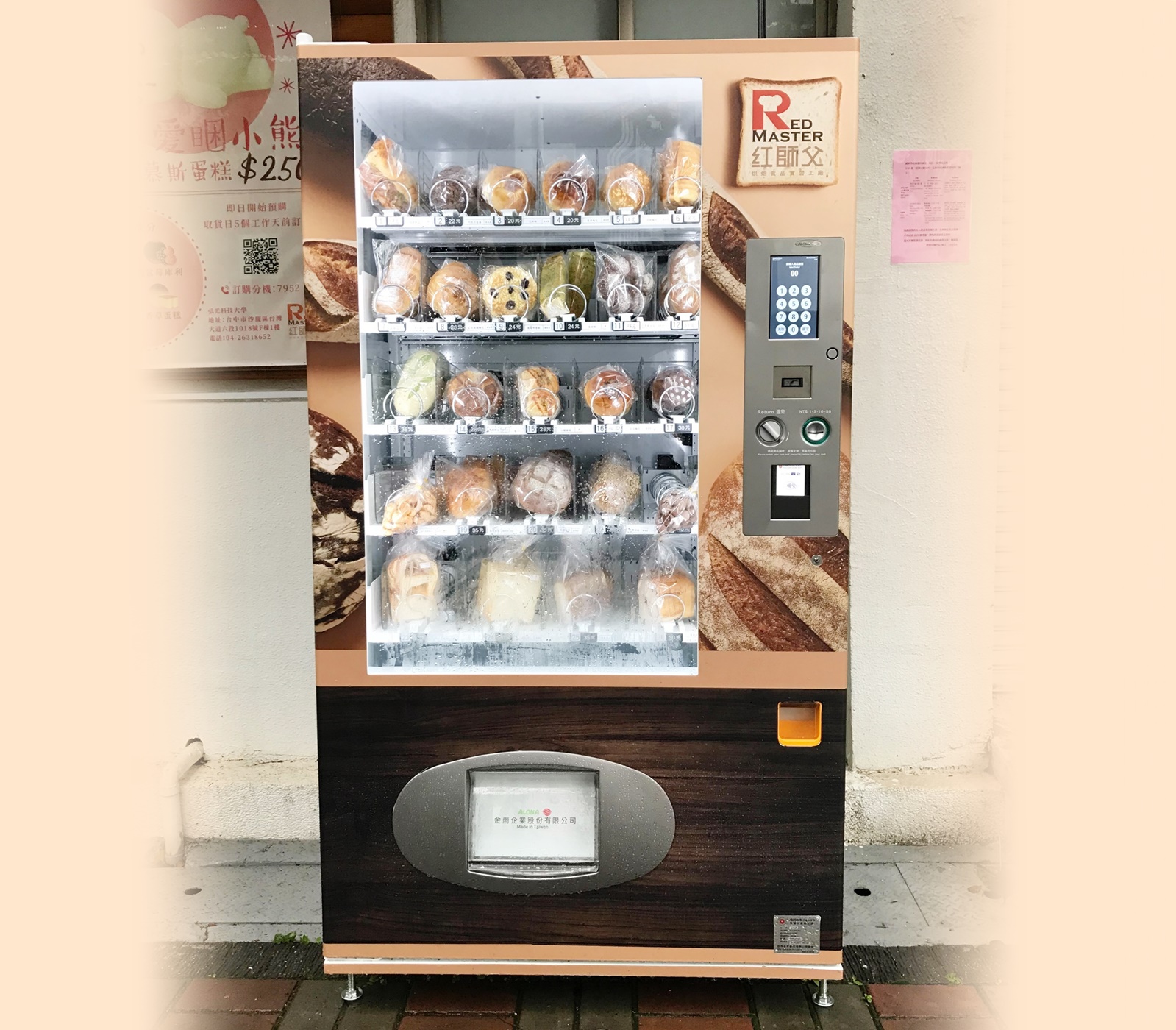 讓校園更智慧便利,營運行銷中心本學期起在校內設置自動販賣機24小時販售紅師父每日現做新鮮麵包、學校紀念品及產學合作商品,使用現金、信用卡或各