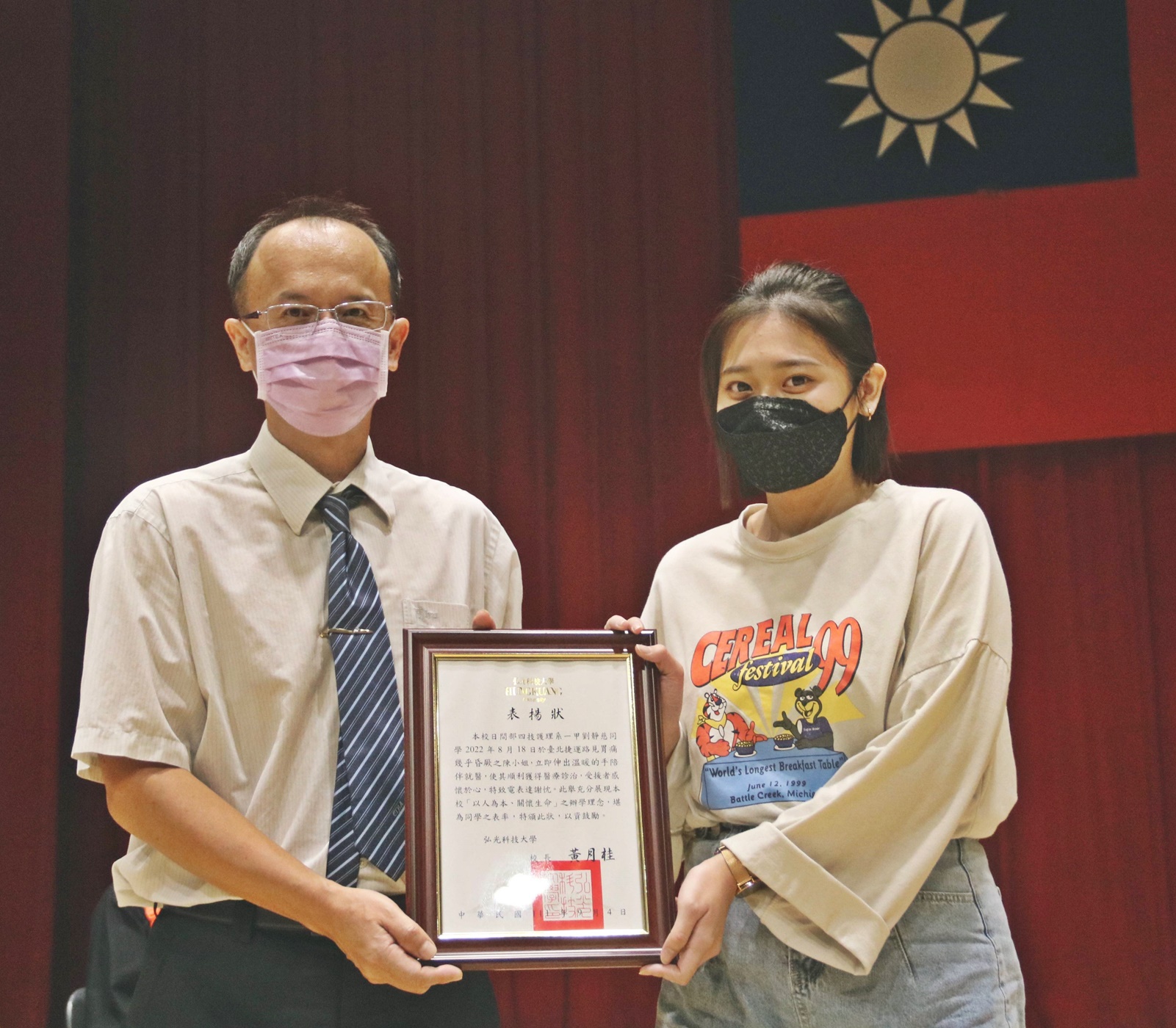 本校9月4至6日舉辦新生啟航校園文化體驗活動,4日新生入學輔導開訓典禮,副校長潘世尊特別表揚護理系一年級新生劉靜慈,在台北捷運站看到陳小姐腹