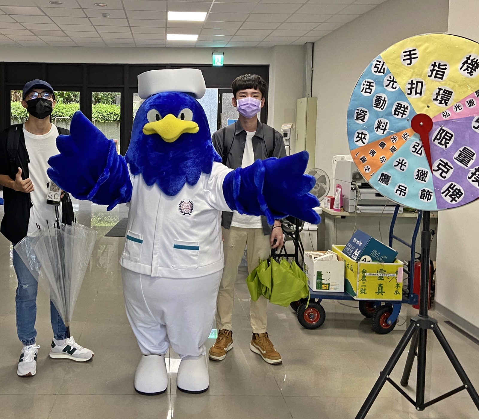 9月12日開學,配合校園防疫新制,舉辦「大學生、禮貌聲─開學防疫禮貌週」活動,由於梅花颱風帶來雨勢,原本學校吉祥物弘光獵鷹穿著護理師服裝要在