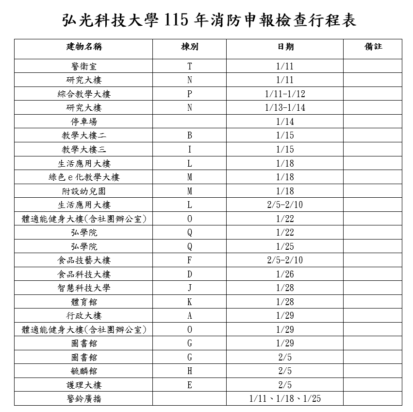 一、校區定期實施年度消防檢查作業,將於1/11開始進行檢查,屆時會有查檢人員至各空間進行檢查,敬請各單位配合,預定時間如下: