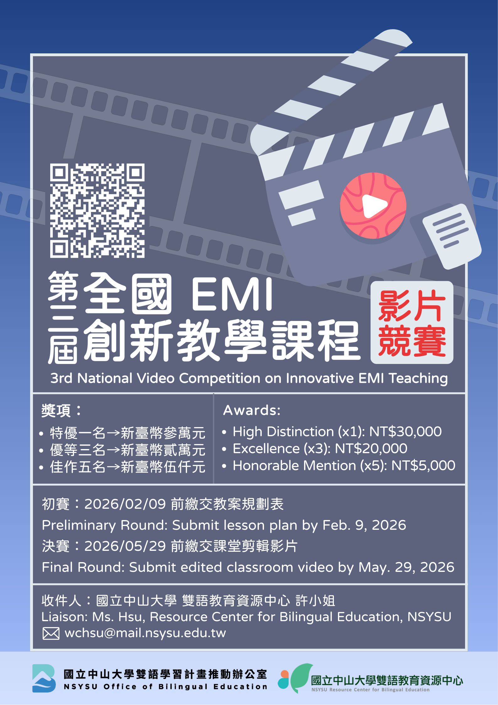 「國立中山大學第三屆全國EMI創新教學課程影片競賽」徵件報名時間,展延至115年2月9日。