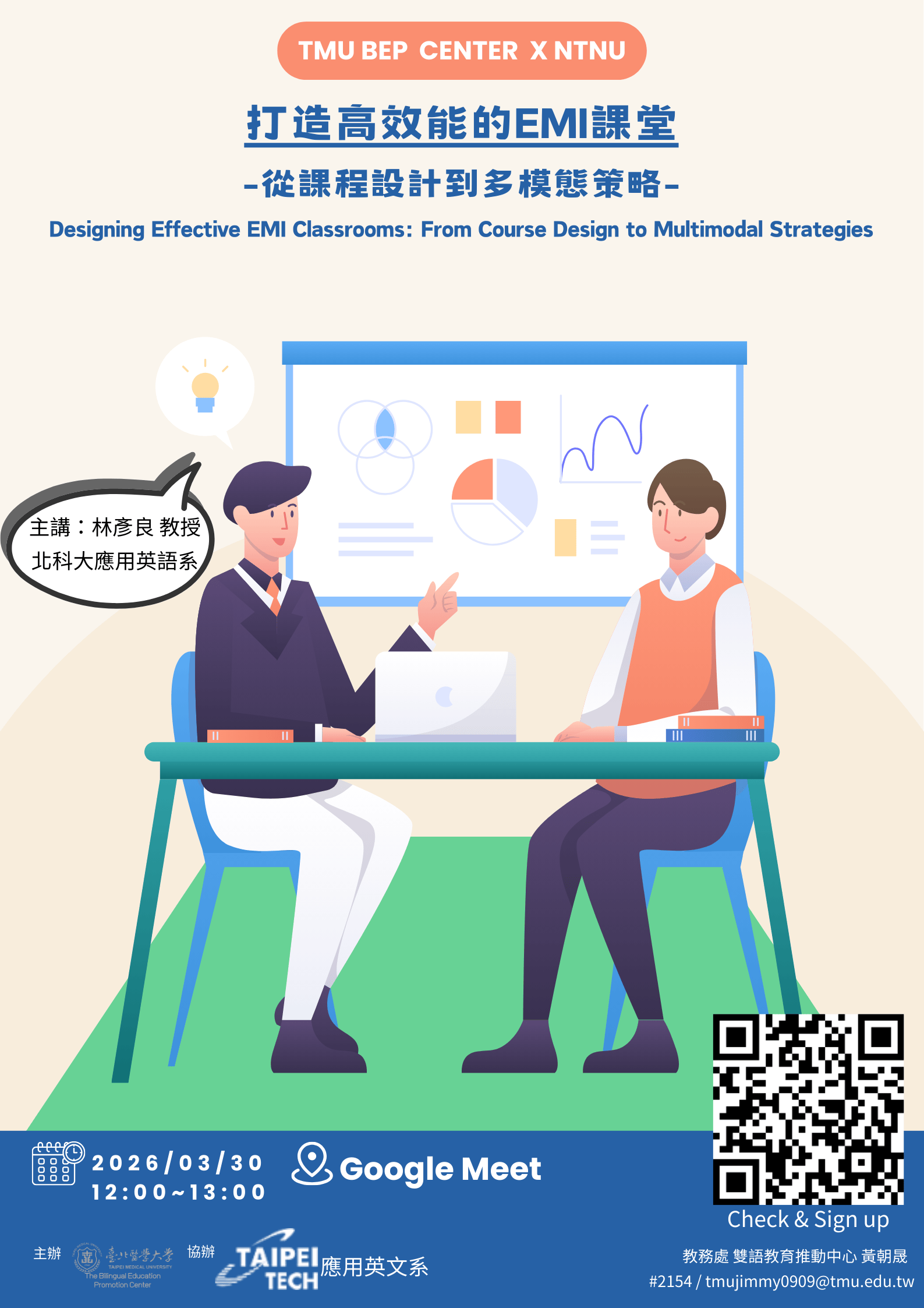 二、本學期辦理活動主題多元,除面向EMI課程外也包含ESAP課程,主題包含以AI輔助設計課程、高成效EMI課程設計、將探究式教學融入EMI課程、ESAP課程設計等等。詳細報名資訊請參照《附件一_活動公告資訊》,以及各場次活動海報