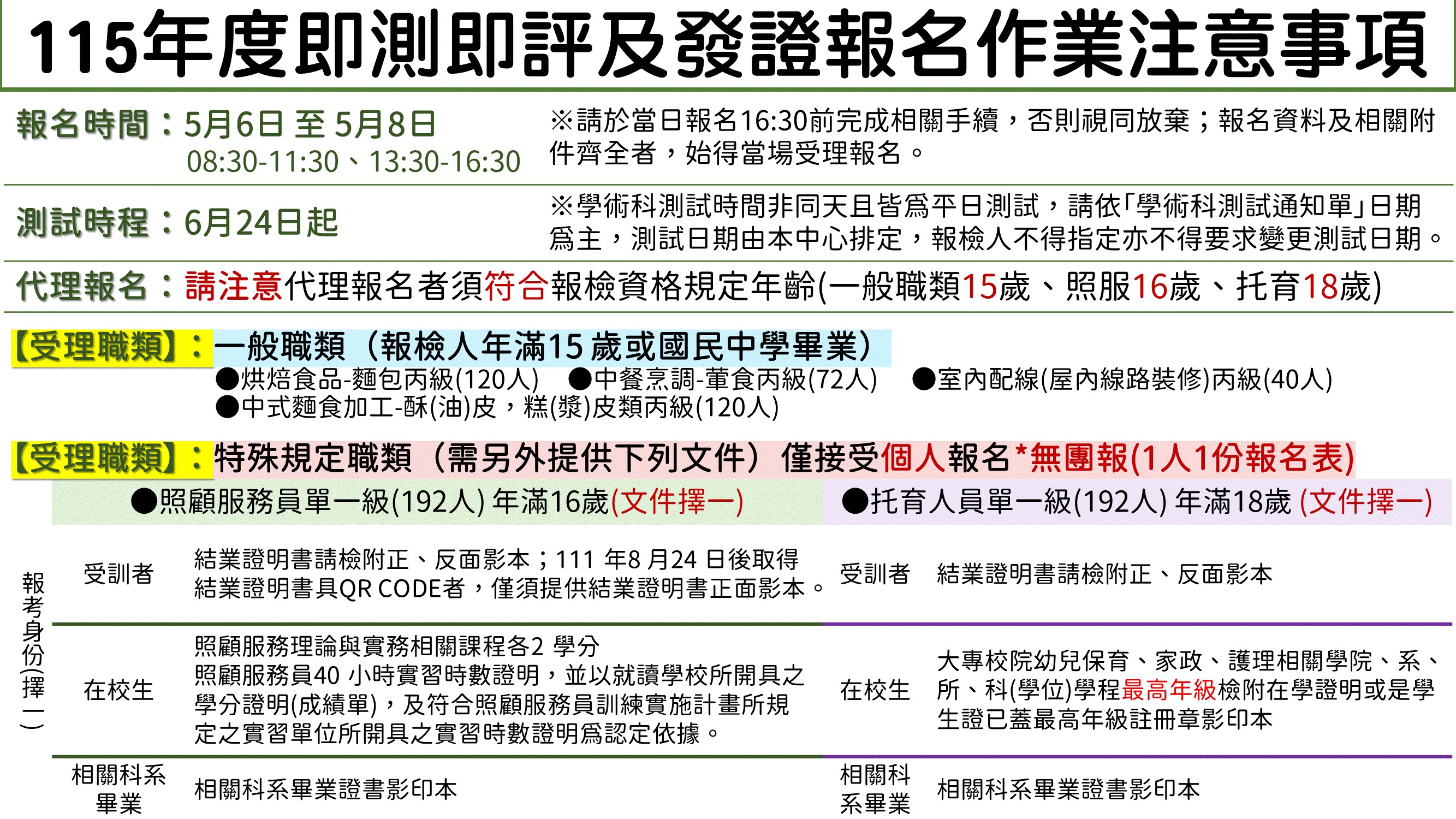 (一)一般職類-1人最多可代理 10人報名,特殊規定職類-僅接受個人報名*無團報(1人1份報名表)。