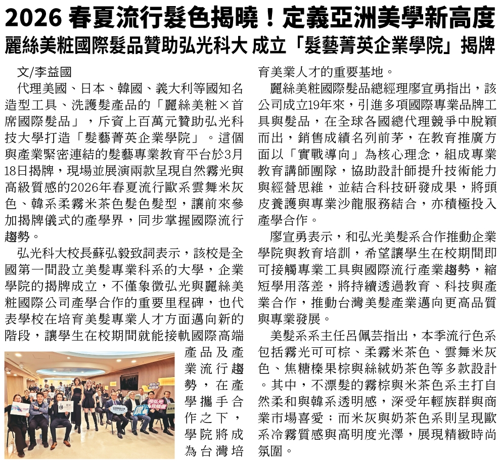 代理美國、日本、韓國、義大利等國知名造型工具、洗護髮產品的「麗絲美粧×首席國際髮品」,斥資上百萬元贊助弘光科技大學打造「髮藝菁英企業學院」。這個與產業緊密連結的髮藝專業教育平台於3月18日揭牌,現場並展演兩款呈現自然霧光與高級質感的2026年春夏流行歐系雲舞米灰色、韓系柔霧米茶色髮色髮型,讓前來參加揭牌儀式的產學界,同步掌握國際流行趨勢。
