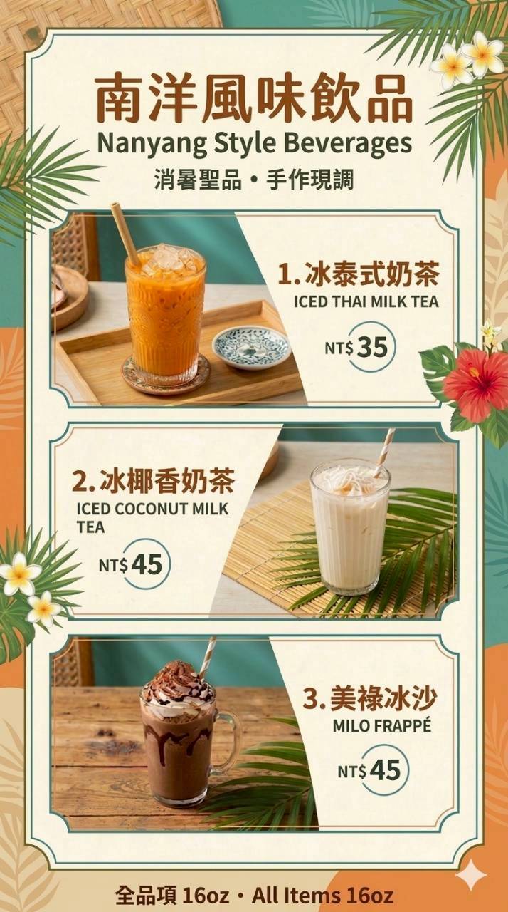 東南亞風味飲清爽上市! 泰式奶茶濃郁順口、椰香奶茶清新滑順、香濃美祿冰沙,消暑首選,快來品嚐弘磨坊特調! 預約電話:04-26318652 分機:5139
