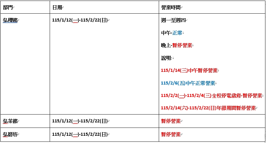 寒假期間115/1/12(一)-115/2/22(日)營業時間調整如下。
