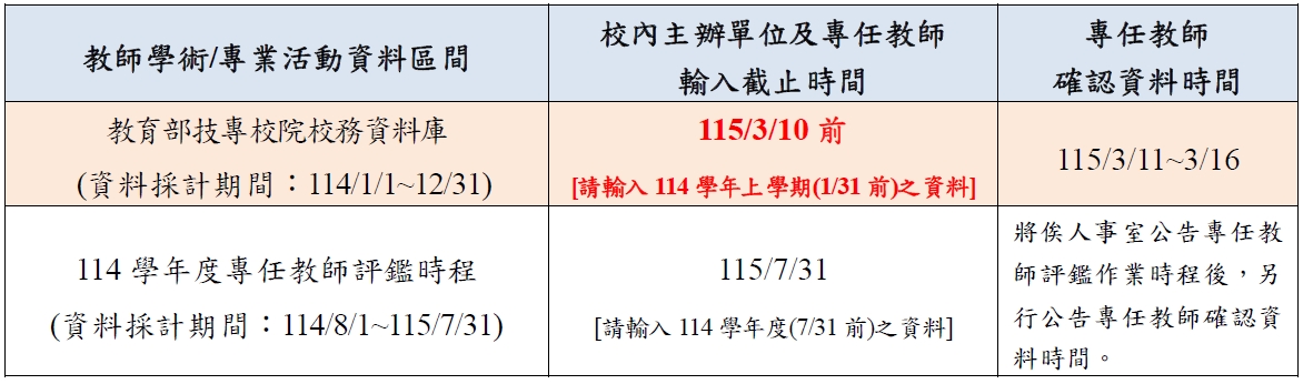 二、 專任教師學術/專業活動資料維護區間及填報作業時程: