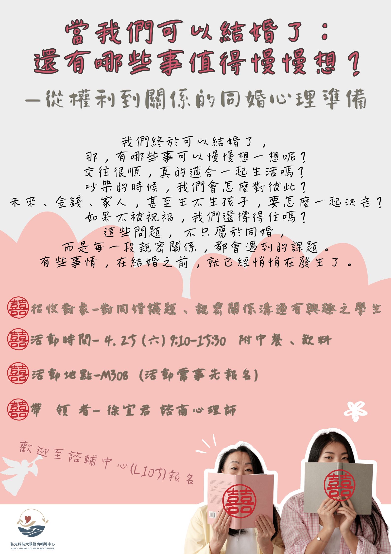 【假日工作坊 當我們可以結婚了,還有哪一些事情值得慢慢想:從權利到關係的同婚心理準備】 當我們可以結婚了,關係~真的就準備好了嗎? 交往很順,真的適合一起生活嗎? 吵架的時候,我們會怎麼對彼此? 未來、金錢、家人,甚至生不生孩子,要怎麼一起決定? 有些問題,不只屬於同婚, 而是每一段關係,都會慢慢遇到的事。 同婚,也有屬於同婚的獨特之處 這是一場輕鬆的工作坊,不用有標準答案, 給自己一點時間,看看自己在關係裡的樣子, 讓我們在事情發生前,有一些時間可以慢慢的思考。 👥 對象|對戀愛/關係/同婚議題有興趣者皆可參加 (有伴、沒伴、曖昧中都歡迎) ✨ 一起來想一想:我們想要的關係,長什麼樣子? 📌報名資訊 日期:4/25 (六) 9:10-15:30(中午供餐、飲料) 活動地點:M308團體室 報名地點:諮輔中心L105 (需事先報名) ~~~~本場次可認證人文精神加分~~~~~ |