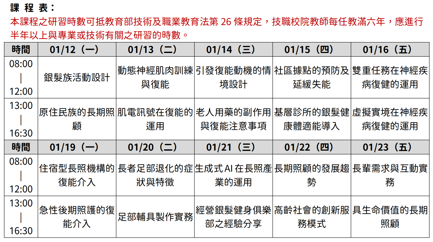 在教育部的支持下,「全人長照物理治療菁英培育基地」順應長照需求的趨勢而建置完成。除了善用基地設備教授物理治療專業知能外,教師對於目前長照界尊重長者自主、預防及延緩失能與重視功能性體適能的新型服務模式應有全新的體認。本研習課程將邀集跨專業師資就上述主題協助物理治療教師的增能,並安排教師至有本股份有限公司所建置的好好園館進行研習,透過業師講解說明,瞭解台灣佔84%銀髮族的健康與亞健康族群真正想要的健康體適能生活。課程目標將期待研習教師在吸收新思維後,結合基地精良設備,在課程中融入實務與長者需求,以培育長照產業所需的物理治療人才。