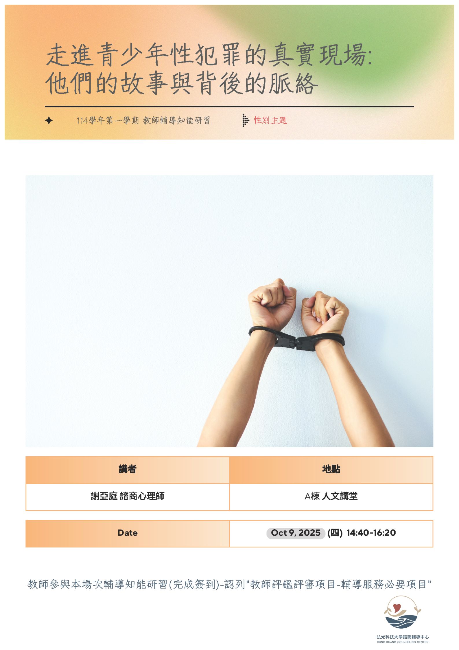 二、此「性平主題教師輔導知能研習–走進青少年性犯罪的真實現場:他們的故事與背後的脈絡」列入本校整發經費成效指標,請各位師長務必完成。