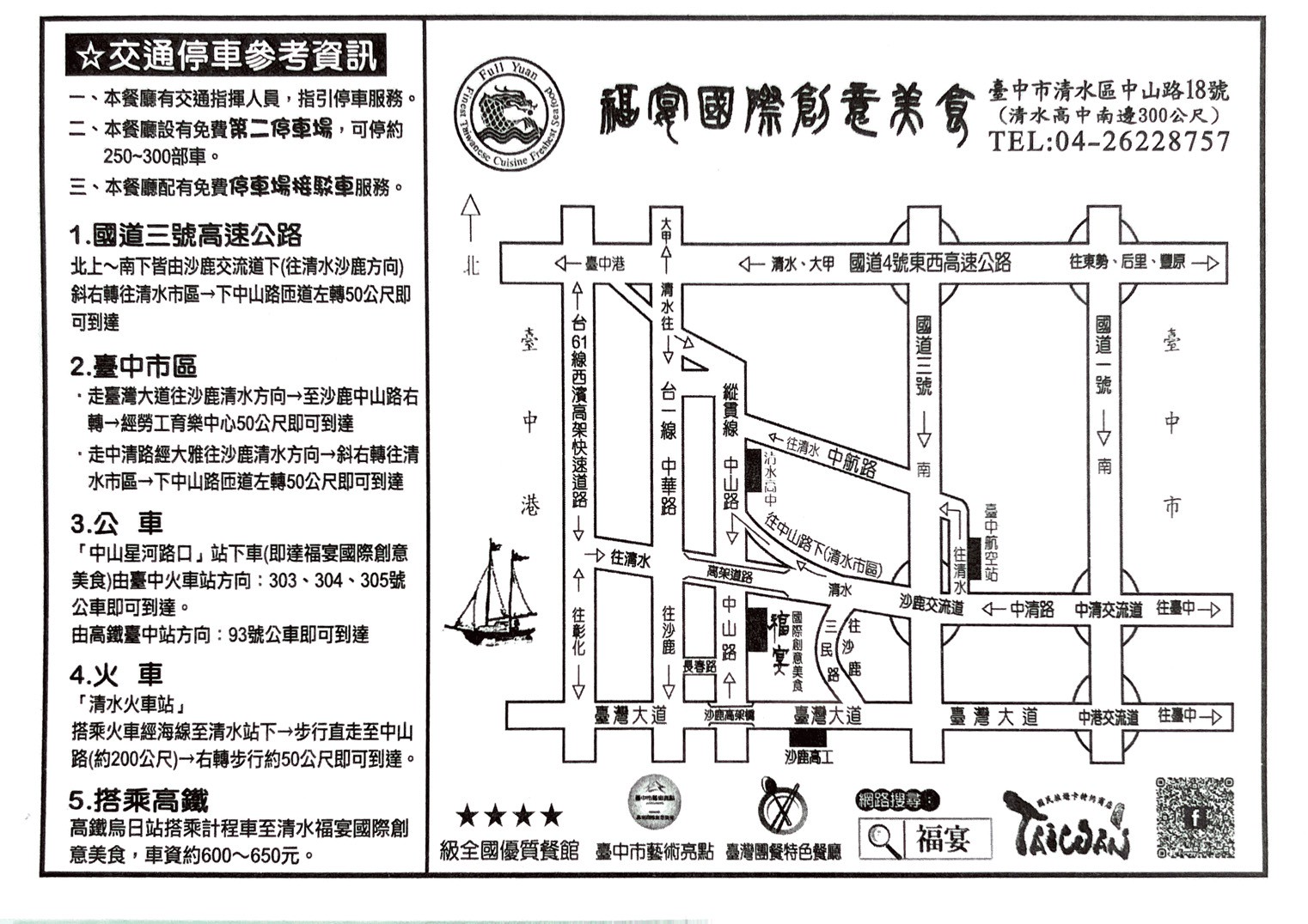 (一)由臺中火車站往清水方向可搭乘路線303、304、305號公車,下車站點:「中山星河路口」站(即餐廳位置)。