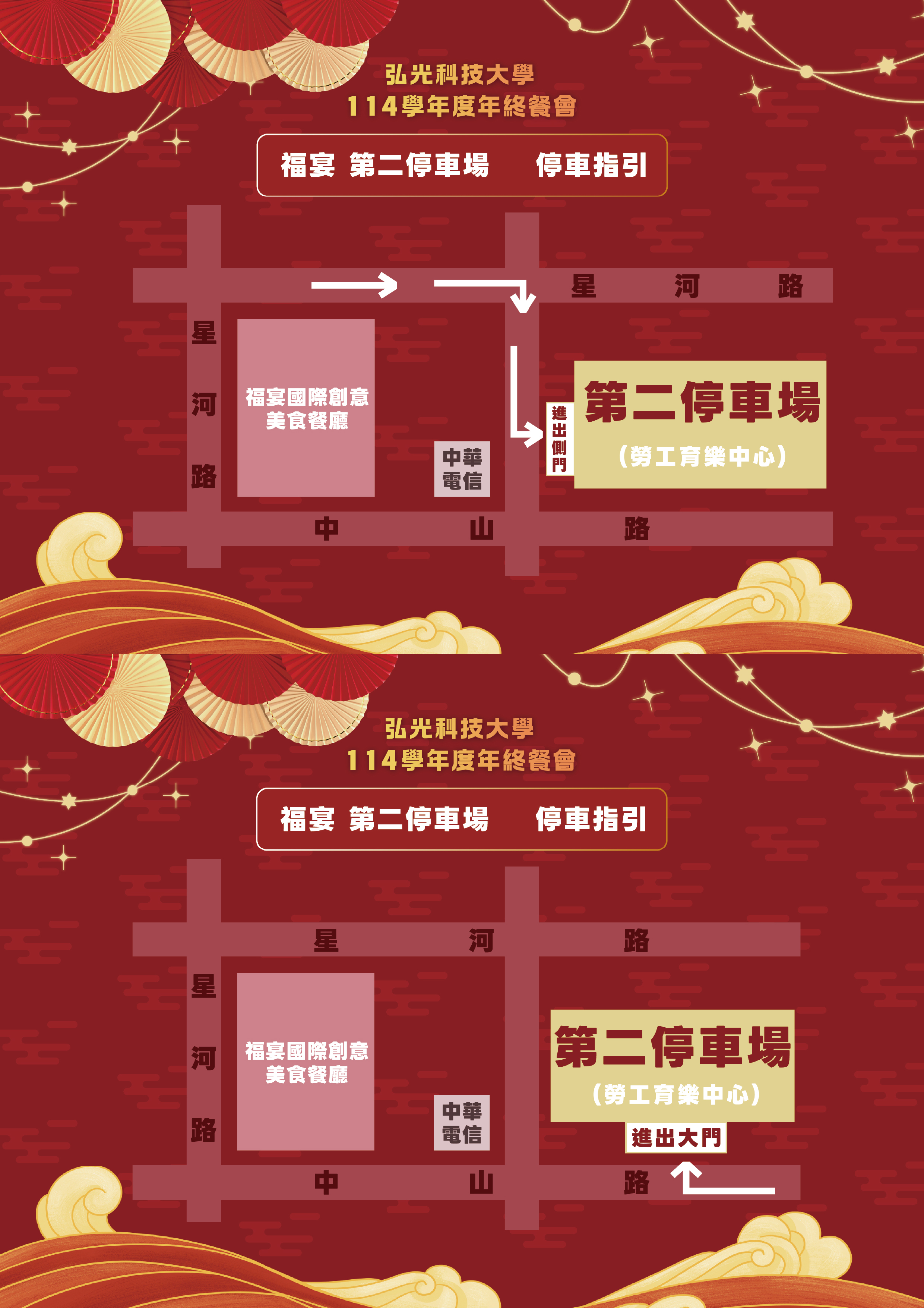 本校謹訂於115年1月14日(星期三)中午12:00,設席於「福宴國際創意美食餐廳」,舉辦「114學年度年終餐會」活動,相關交通停車及會場內座位配置說明如下: