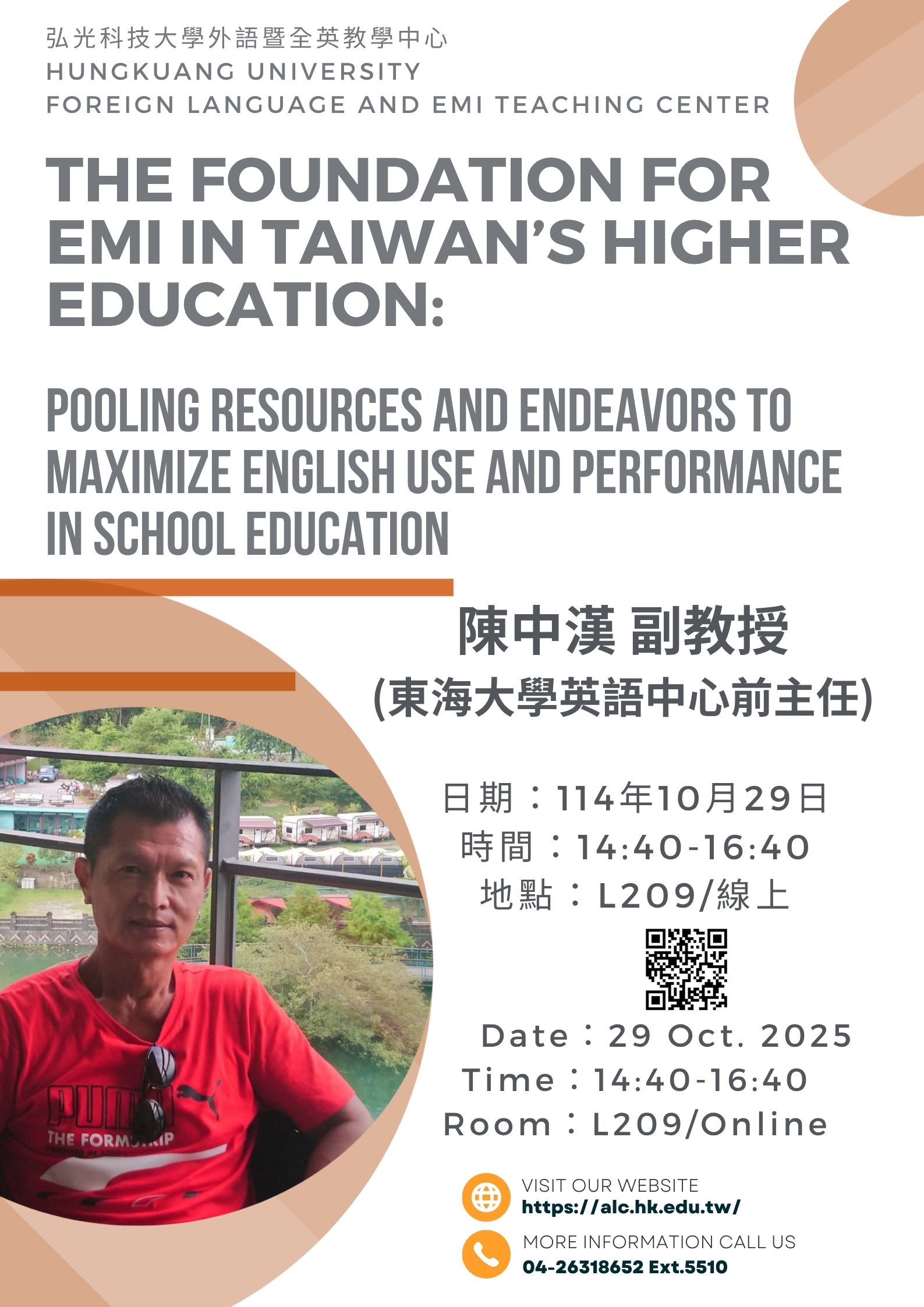 講題:The Foundation for EMI in Taiwan’s Higher Education: Pooling Resources and Endeavors to Maximize English Use and Performance in School Education
