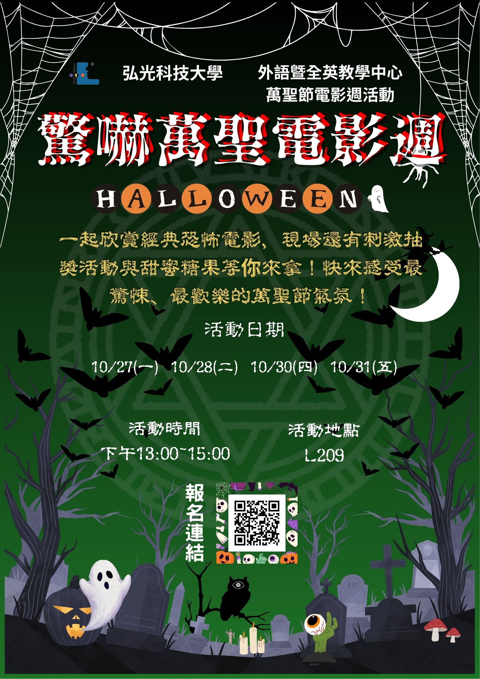 外語中心「驚嚇萬乘電影週」活動開放報名! 10月27日、28日、 30日、31日 將播放萬聖節主題相關的英文及外文電影,每日片單皆不同。現場提供萬聖節糖果及隨機問答等互動活動,邀請大家一同共度萬聖節時光。活動結束後亦設有抽獎活動,歡迎踴躍參加!
