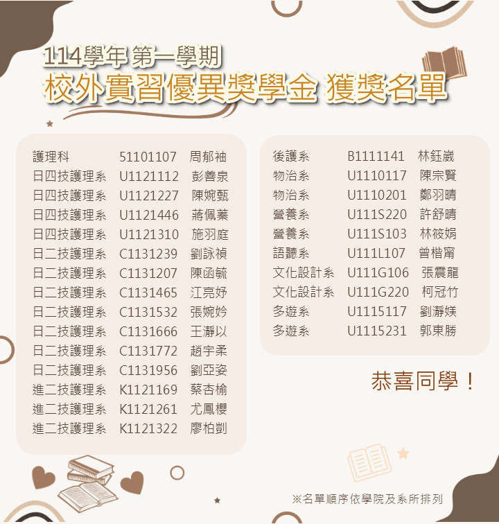 一、114學年度第1學期學生學校外實習優異獎學金名單作業已完成。
