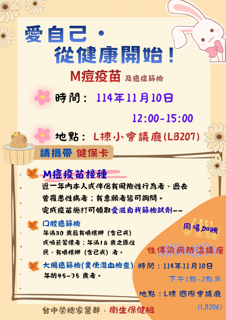 【衛保組活動公告-更正】性傳染病防治活動(M痘疫苗接種、癌症篩檢),歡迎有興趣之教職員工生現場諮詢,由台中榮總團隊為您服務。