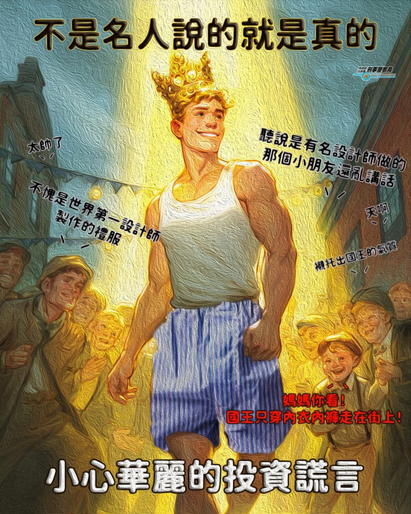 很多投資詐騙都愛套上「名人背書」「專家推薦」的光環,看起來超華麗,其實像國王的新衣——好看但根本沒東西。