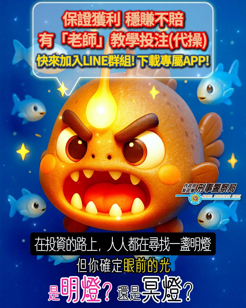 近來詐騙集團透過 Facebook、Instagram、YouTube 投放假廣告,以「投資名師」、「飆股老師」、「內線消息」為誘因,引導民眾加入 LINE 投資群組,再以「保證獲利」方式詐取金錢,請大家提高警覺,避免受騙!