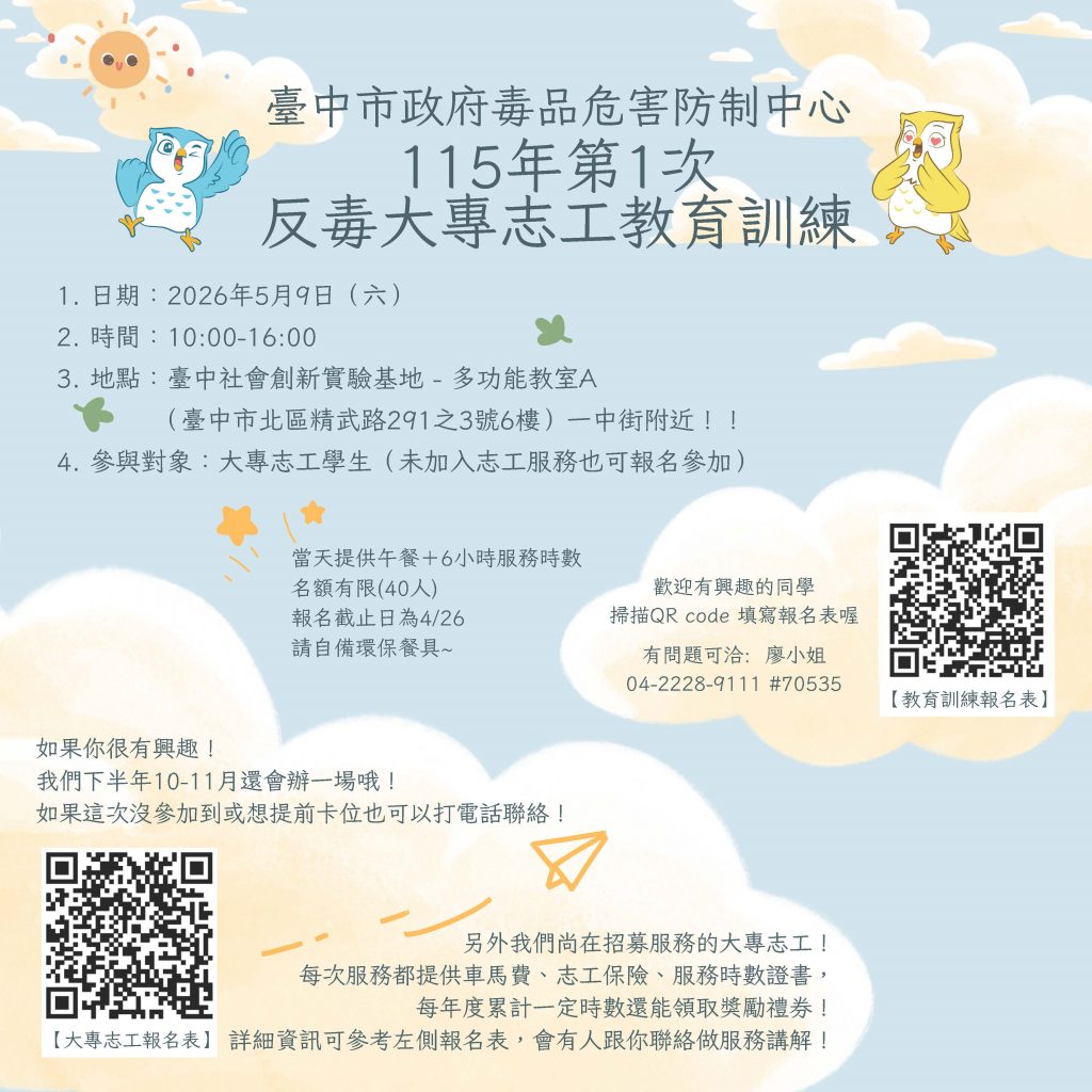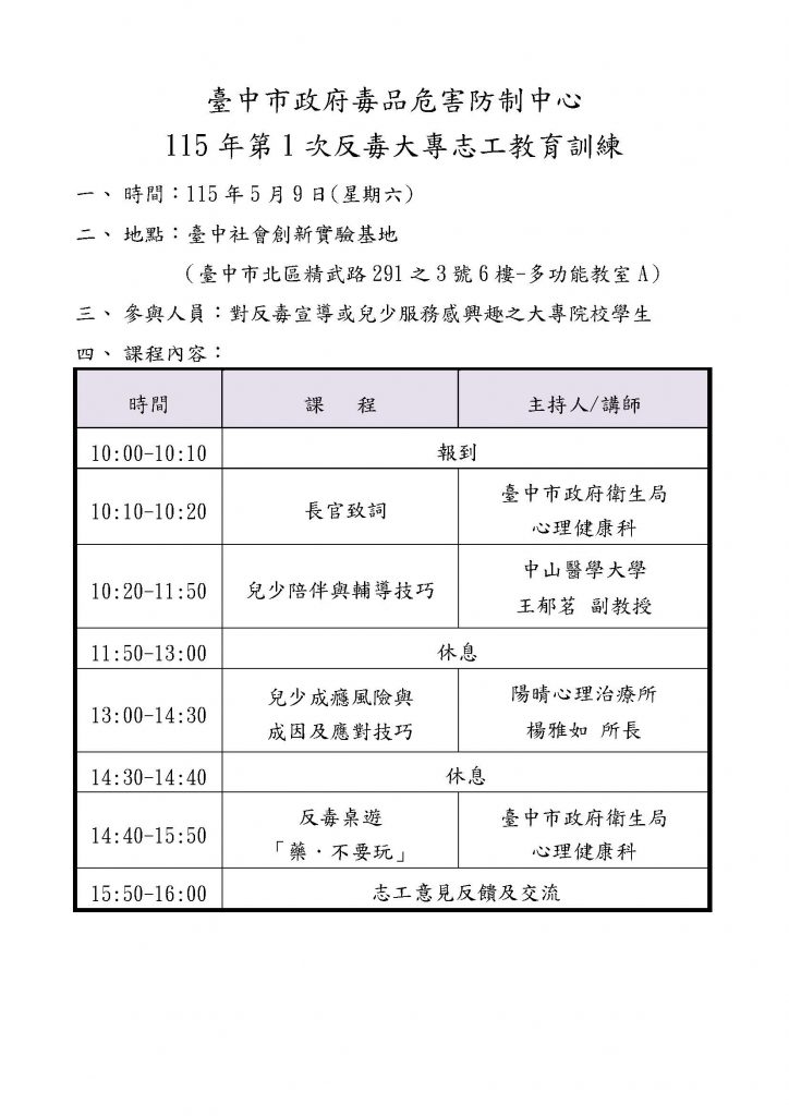 一、為提升大專志工對兒少發展及成癮行為(含藥物、網路及遊戲成癮)之專業知能,強化情緒支持與危機辨識能力,臺中市政府毒品危害防制中心將於115年5月9日(星期六),在臺中社會創新實驗基地6樓-多功能教室A(臺中市北區精武路291之3號6樓)辦理第1次反毒大專志工教育訓練。