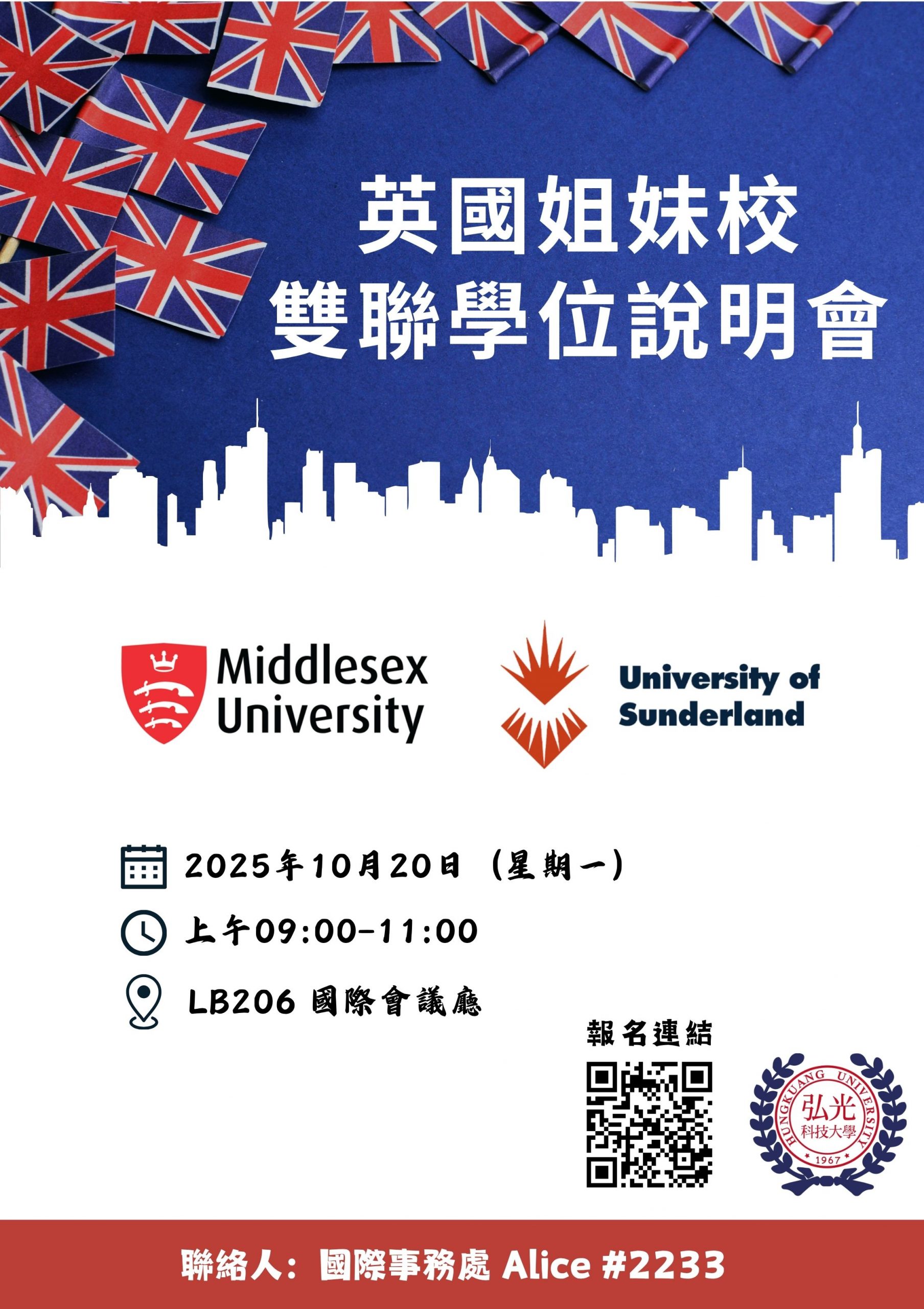 英國姐妹校Middlesex University、University of Sunderland即將來校辦理雙聯學位說明會,活動詳情如下: