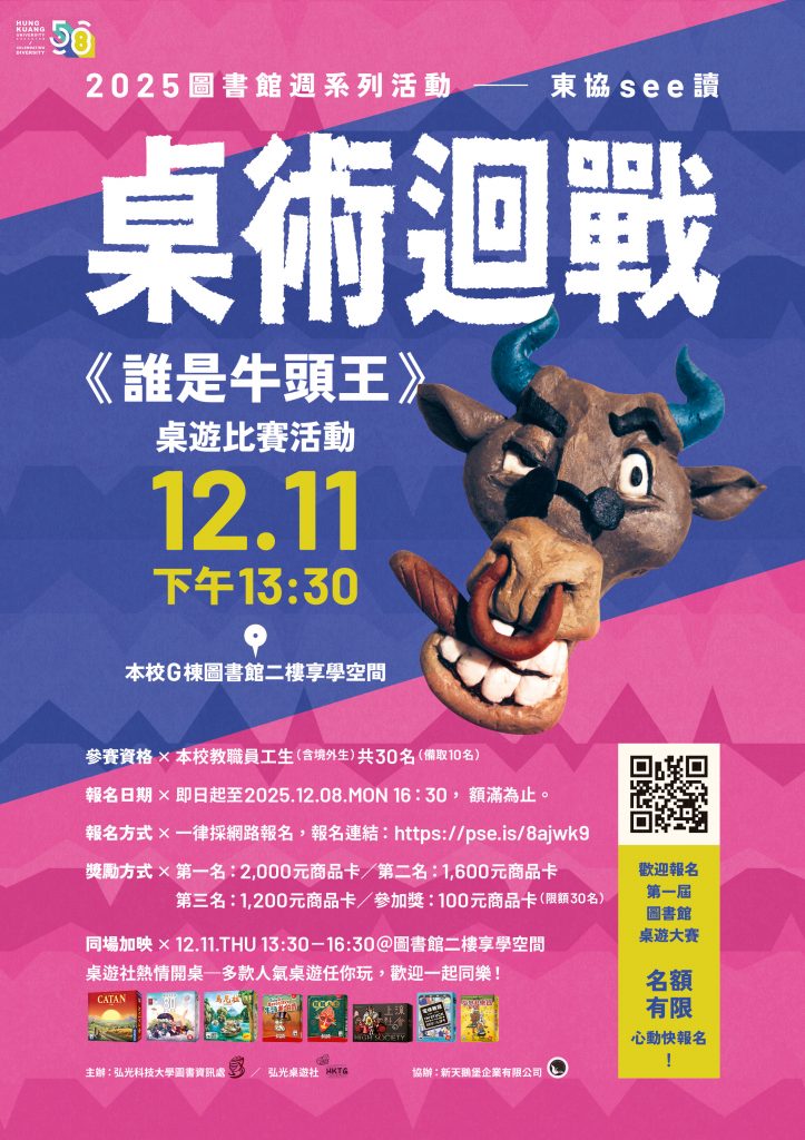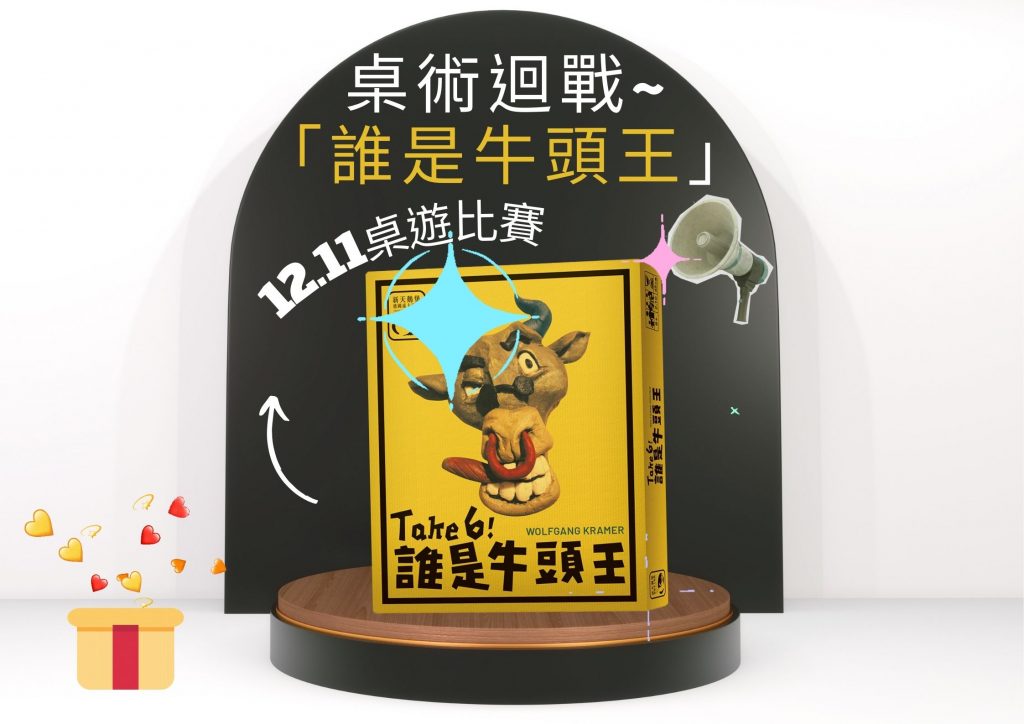 圖書館第一屆桌遊比賽《誰是牛頭王》活動即將於12/11(四)下午13:30登場,現場除了給網路報名比賽的選手競技以外,還有同場開放體驗桌給想要體驗桌遊的讀者唷,不限定對象皆歡迎參加!