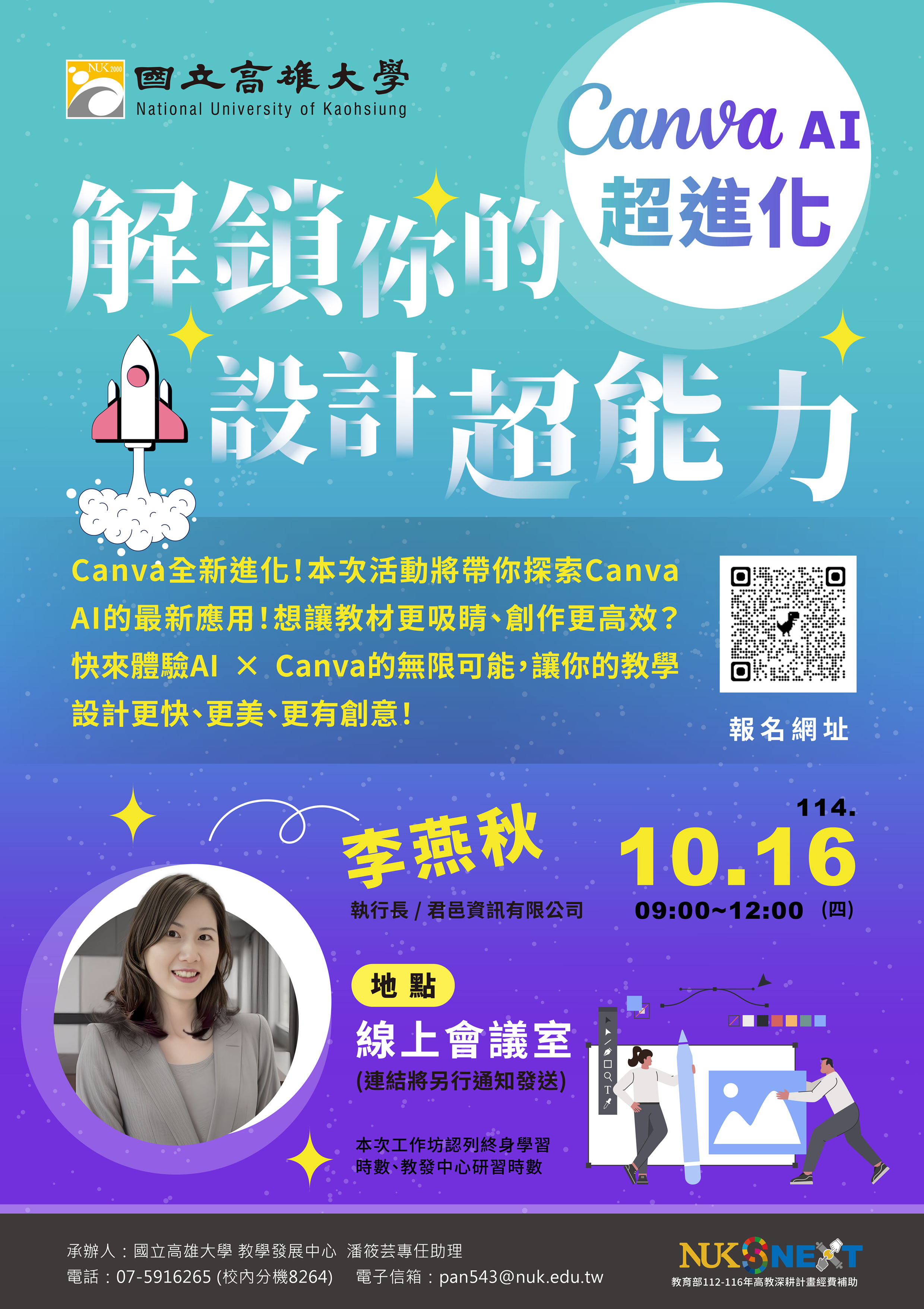 4、報名網址:https://reurl.cc/6qM07d,與會者需自備Canva教育版或專業版帳號再行報名。