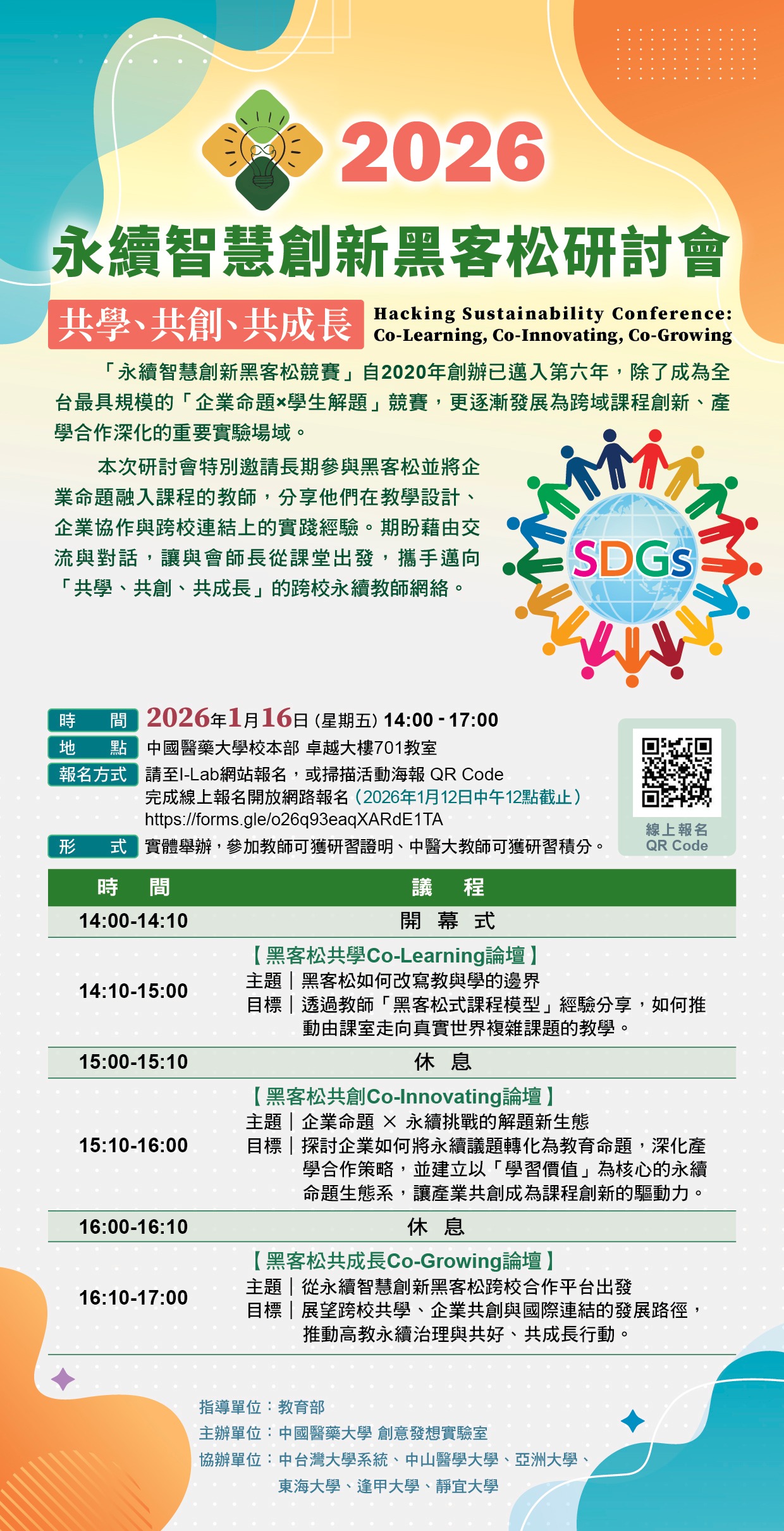 【函轉-中國醫藥大學】本校舉辦「2026永續智慧創新黑客松研討會:共學、共創、共成長」教師研習活動,開放網路報名(115年1月12日中午12點截止)。