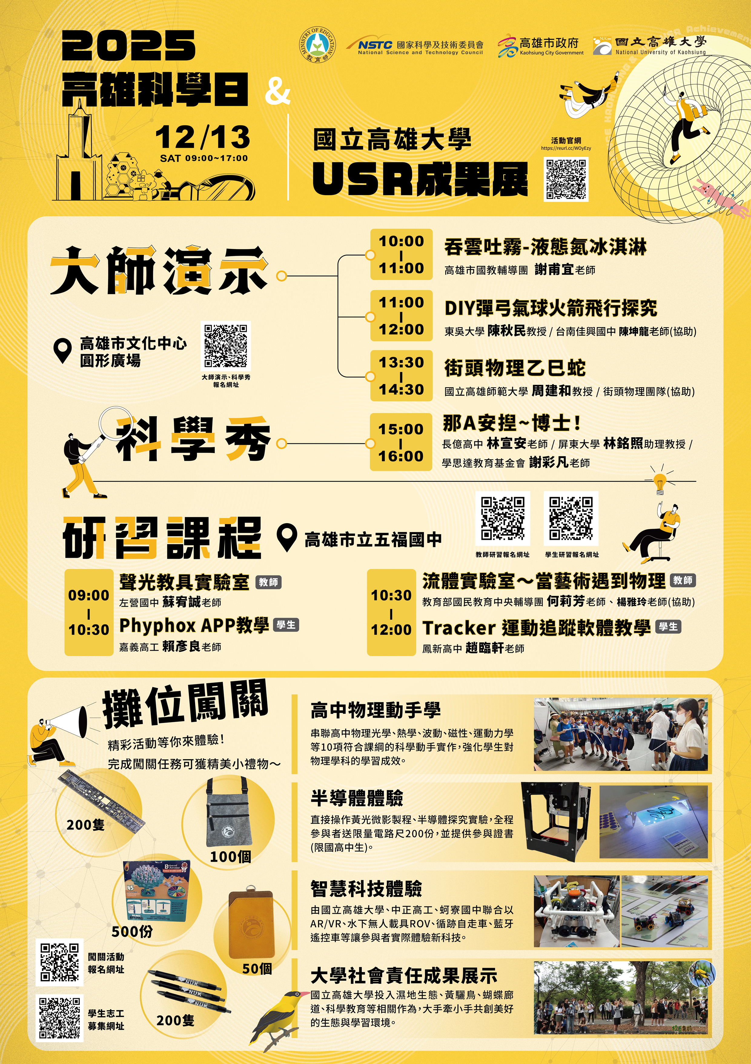 | 一、 | 為推廣科學教育與分享本校師生執行USR計畫豐碩成果,辦理旨揭成果展,透過大師演示、科學秀、大眾科普、半導體製程體驗、智慧科技體驗,及教師與學生研習,以擴大各界交流。 | |||||