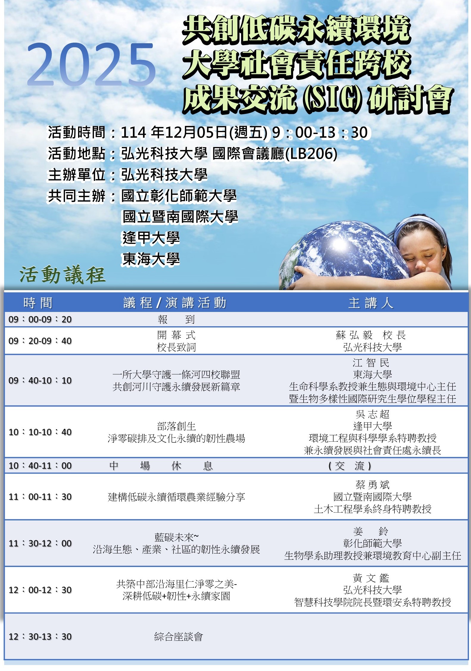 今日(12月5日)由智慧科技學院黃文鑑院長帶領【共築中部沿海里仁淨零之美-深耕低碳+韌性+永續家園】USR 計畫團隊,舉辦【共創低碳永續環境大學社會責任跨校成果交流(SIG)研討會】。本研討會由胡庭禎副校長、永續發展辦公室夏嘉梅主任、智慧科技學院黃文鑑院長致歡迎詞,其後邀請友校東海大學生態與環境研究中心江智民主任、逢甲大學永續發展與社會責任處吳智超永續長、國立暨南國際大學土木工程學系蔡勇斌終身特聘教授以及彰化師範大學生物學系姜鈴助理教授,進行演講,共同參與議程。
