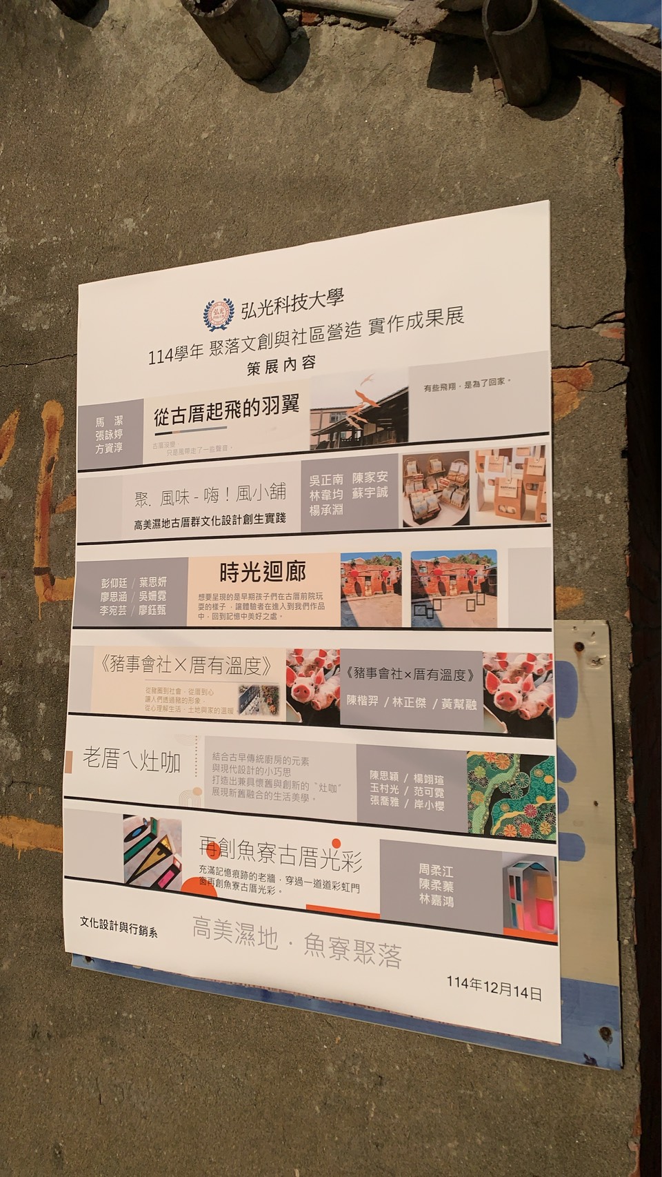 時間飛逝,期末即將到來,學生們無不加足馬力準備各個學科的成果報告。昨日(12月15日)在「弘光高美USR工作站」舉辦了一場別開生面的活動:聚落創生與社區營造實作成果展。我校文化設計與行銷系學生,一早便從學校出發,在强勁的海風吹拂下,學生們顧不得自己被吹得狂亂的頭髮,一路上小心保護自己的作品,在戶外奮力搭建展品,只爲了下午完美的呈現。