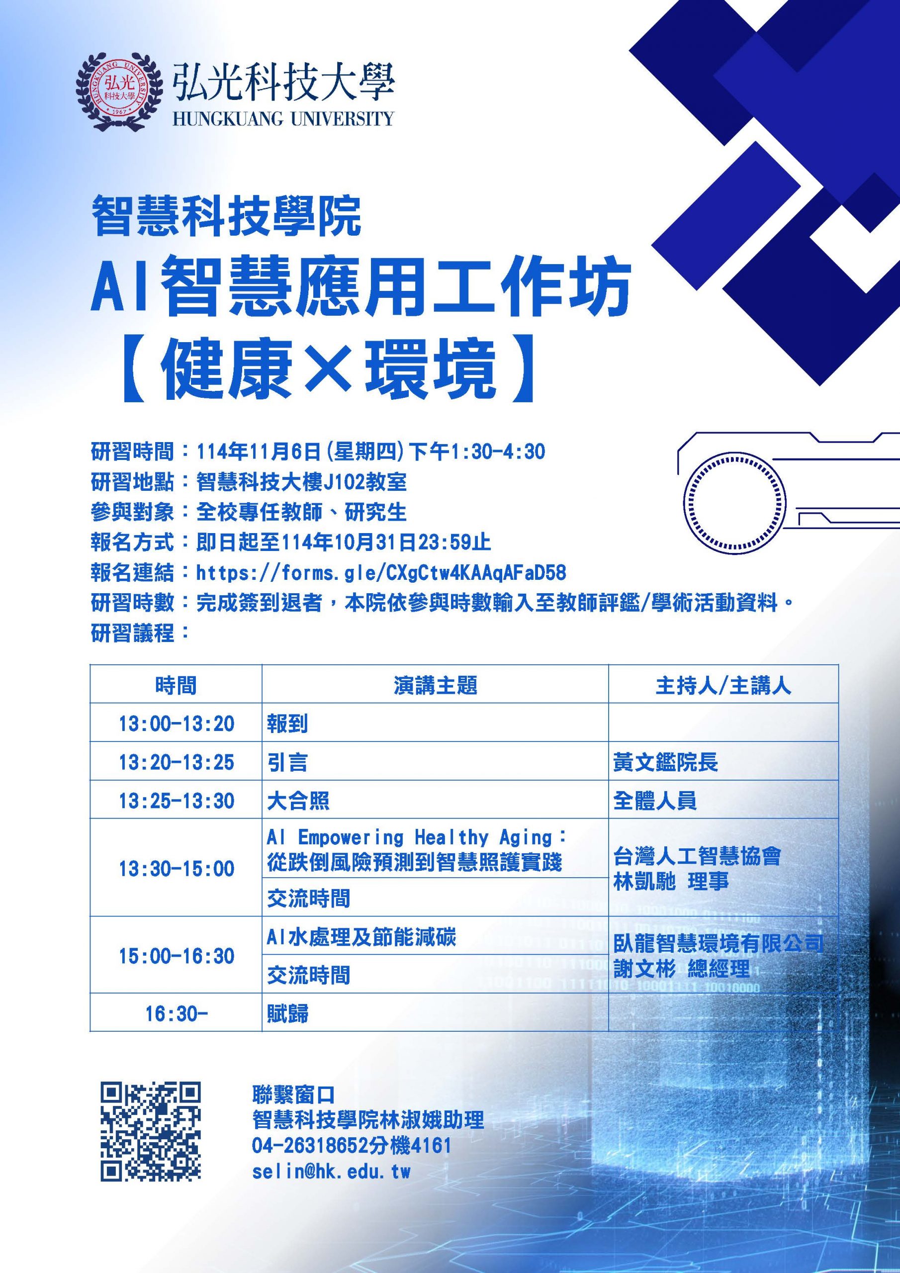 主旨:敬邀全校專任教師參與114/11/06(四)智慧科技學院AI智慧應用工作坊【健康×環境】