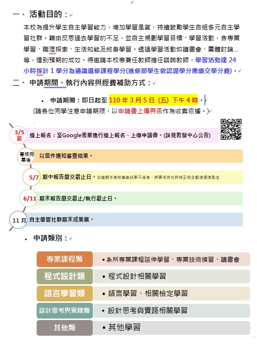 109-2學期「多元自主學習社群」徵件申請開始囉!
