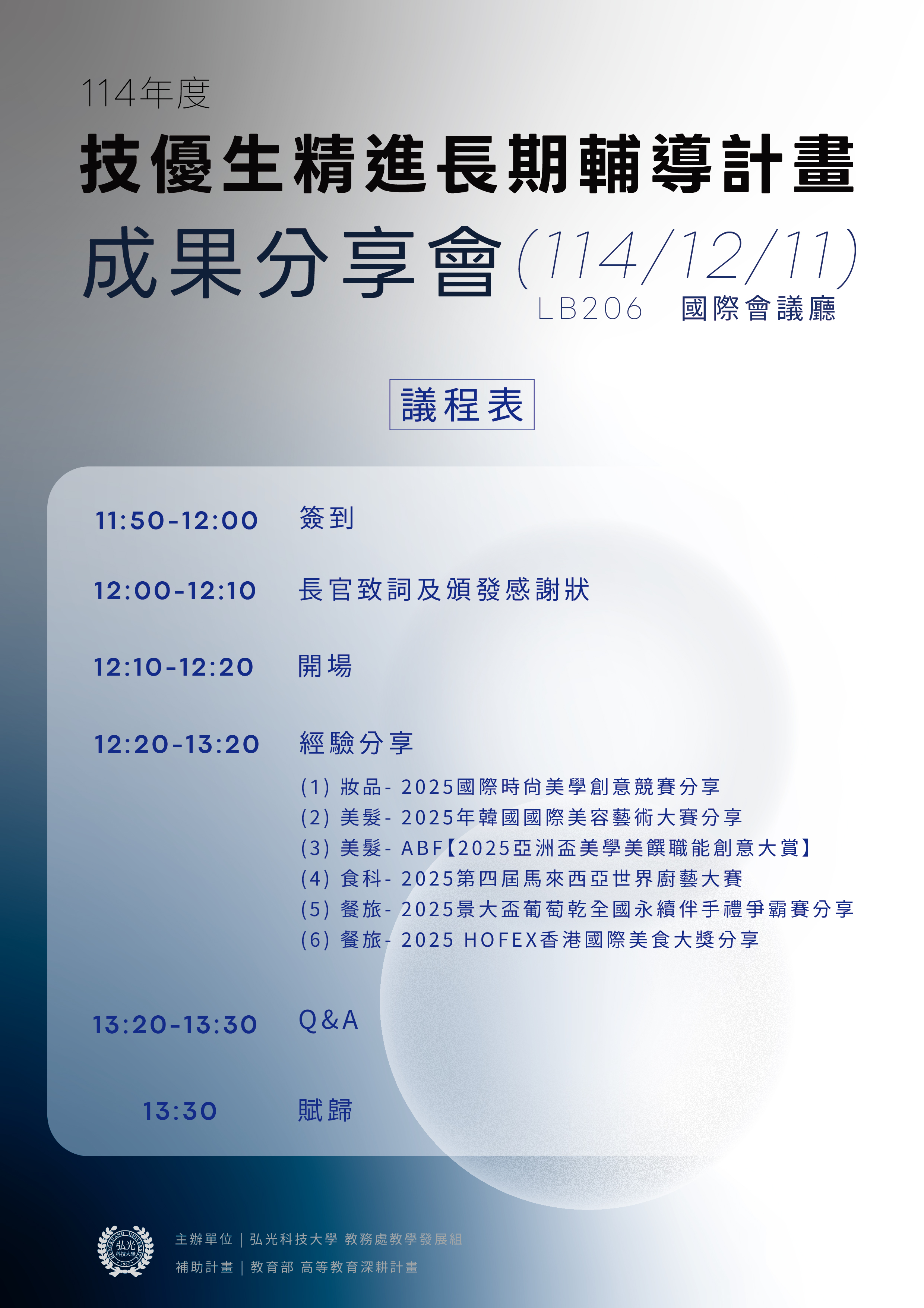 | 12:20 | 13:20 | 經驗分享 1. 妝品- 2025國際時尚美學創意競賽分享 2. 美髮- 2025年韓國國際美容藝術大賽分享 3. 美髮- ABF【2025亞洲盃美學美饌職能創意大賞】 4. 食科- 2025第四屆馬來西亞世界廚藝大賽 5. 餐旅- 2025景大盃葡萄乾全國永續伴手禮爭霸賽分享 6. 餐旅-2025第六屆上海國際廚藝競賽 |